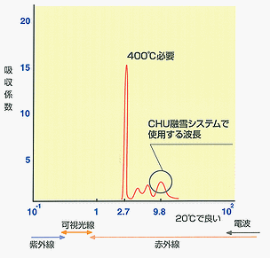 雪や氷は、2.7ミクロンの波長をもっとも吸収します。 しかしながらこの波長を発生させるには400℃以上の熱源が必要になりロードヒーティングやルーフヒーティングには実用的ではありません。 当社のCHU融雪システムでは次に吸収率の高い9.8ミクロンを使用しています。 9.8ミクロンの波長は20℃前後の熱源で発生するためランニングコストも抑えられ実用的です。 |