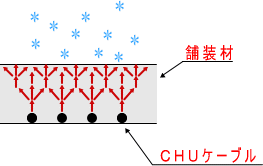 CHU融雪システムの特性 遠赤外線を効率よく放射する遠赤素子を路面舗装と、CHUケーブルに混ぜることで、伝導熱と遠赤外線効果により『省エネルギー、低コスト』な融雪を実現しました。このシステムは従来の電熱方式に比べ電気料金が約30%〜50%お得になります。 |